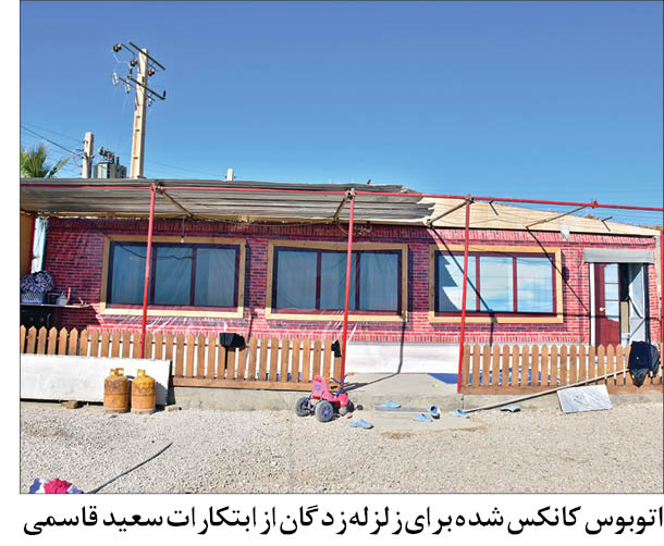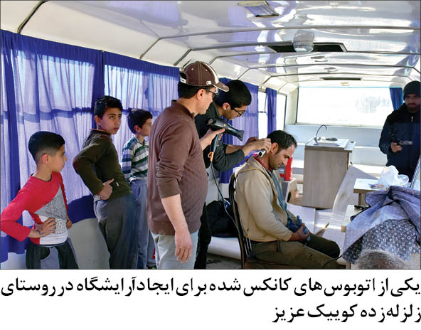 همچنین در روستای "کوییک عزیز" شاهد بودیم برخی گروه های جهادی به سرپرستی حاج سعید قاسمی از فرماندهان سابق دفاع مقدس و مسئول بازسازی قرارگاه سازندگی حاج احمد متوسلیان، اتوبوس های اسقاطی را تجهیز کردند و سعی داشتند تا به عنوان کانکس از آن ها استفاده کنند. ایده جالبی بود اما تعداد این اتوبوس ها کم و برای اهالی منطقه ناکافی است و همین موضوع می تواند ناهماهنگی هایی را ایجاد کند، به نظر می رسد استفاده از این نوع کانکس ها برای امور عمومی مناسب تر باشد از جمله یک نمونه که از آن به عنوان آرایشگاه استفاده می شود البته اصولا روستای "کوییک عزیز" نمونه جالبی از اقدامات پس از زلزله است. روستایی که رهبر انقلاب نیز در آن حضور یافتند. در این جا انواع کانکس های اهدایی ساخته شده توسط سپاه و ارتش، گروه های مردمی و غیر دولتی و حتی نمونه هایی از کانکس های آلومینیومی آکاردئونی که به راحتی بسته و باز می شوند دیده می شد.