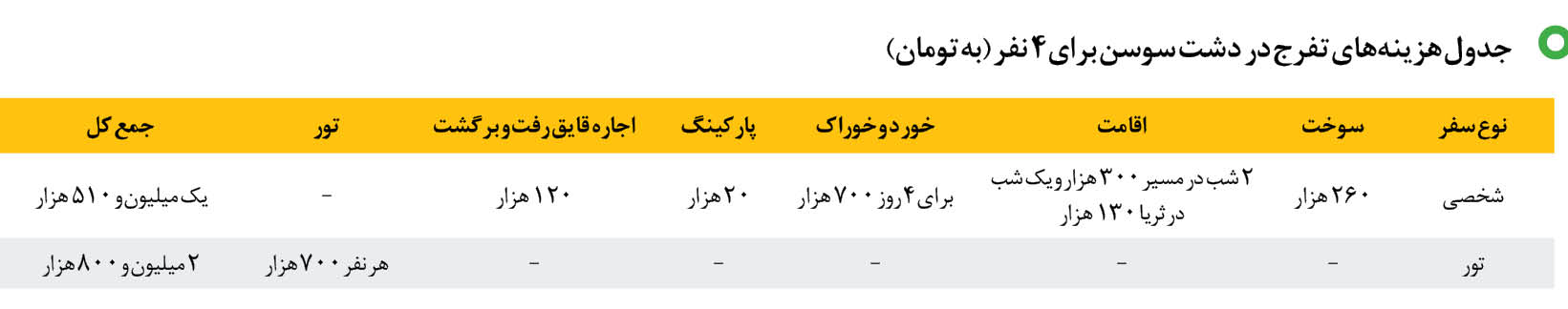 برای گشت و گذار در «دشت سوسن» باید فرصت سه تا چهار روزه ای را در نظر بگیریم. اگر می خواهید در دشت کمپ بزنید، حتما از پیش بینی هواشناسی آگاه باشید. مسئله آب آشامیدنی به خاطر وجود چشمه های متعدد آب شیرین در منطقه، تقریبا مرتفع است. اما مسئله خوراک به سبب نبود رستوران، اهمیت می یابد. غذاهای کنسروی و ماهی هایی که خودتان گرفته اید، بهترین گزینه هایی است که شکم تان را طی این چند روز سیر می کند.