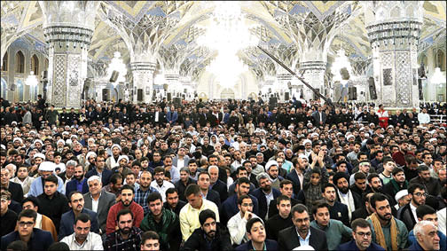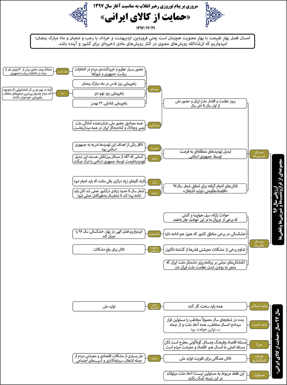 حضرت آیت ا... خامنه ای رهبر معظم انقلاب اسلامی در اولین روز سال 1397 در اجتماع عظیم زائران و مجاوران حرم مطهر رضوی در رواق امام خمینی(ره) و صحن های اطراف حرم، با اشاره به استحکام و نشاط انقلاب در 40 سالگی و خنثی شدن نقشه شوم آمریکایی ها برای منطقه، به تبیین چرایی، الزامات و راه های تحقق شعار سال یعنی حمایت از کالای ایرانی پرداختند و با تأکید بر «قابل حل بودن همه مشکلات با نگاه به داخل» و نیز ضرورت توجه و به کارگیری هرچه بیشتر جوانان در میدان های مختلف از جمله عرصه های مدیریتی، افزودند: نسل جوان و پرافتخار این سرزمین، پرچم استقلال، عزت، عظمت و شرافت ایران را بلندتر از هر زمان دیگر به اهتزاز درخواهد آورد. به گزارش پایگاه اطلاع رسانی دفتر حفظ و نشر آثار رهبر معظم انقلاب اسلامی