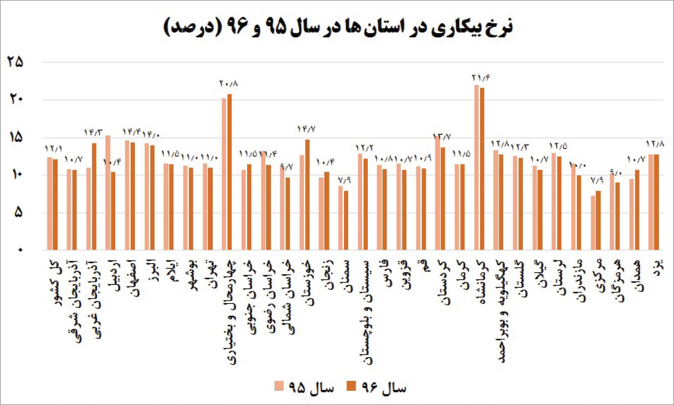 در بین استان های کشور در سال 96، بیشترین نرخ بیکاری مربوط به استان کرمانشاه با 21.6 درصد، چهارمحال و بختیاری با 20.8 درصد و خوزستان با 14.7 درصد بوده است. استان های مرکزی، سمنان و هرمزگان نیز به ترتیب با نرخ بیکاری 7.9، 7.9 و 9 درصد، استان هایی بوده اند که کمترین نرخ بیکاری را داشته اند.