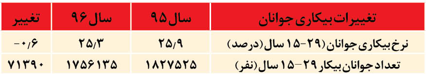 در این زمینه آمارهای دو سال اخیر مرکز آمار ایران نشانگر این است که این نرخ در سال 96، با بهبود اندکی مواجه شده و بر این اساس از تعداد جمعیت جوانان بیکار، در مجموع بیش از 71 هزار نفر کمتر شده است.(جدول پایین)