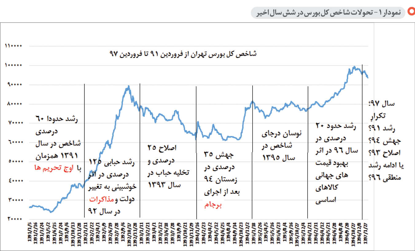 شاخص کل بورس، در سال گذشته عمدتا روند صعودی داشت تا این که بعد از قرار گرفتن در محدود ه 100 هزار واحد در اواسط زمستان گذشته، روند اصلاحی آرامی را پیش گرفت. اما در سال جدید، تحت تاثیر چند عامل از جمله رونق گرفتن بازارهای موازی، تک نرخی شدن ارز و البته تهدیدهای برجامی آمریکا روند اصلاحی تشدید شد تا شاخص حدود 7درصد نسبت به رکورد 95 هزار و 500 واحدی سال 96 افت کند. چنان چه نمودار 1نشان می دهد، این افت حدود 7درصدی نسبت به نوسانات مثبت و منفی سال های اخیر در شرایط تحریمی یا شرایط خوش بینی برجامی، بسیار کمتر است. با این حال این سوال وجود دارد که طی امسال، کدام یک از سناریوها تکرار خواهد شد؟ با خروج ترامپ از برجام، شاخص باز هم افت خواهد کرد یا رشد تحریمی سال 91 تکرار خواهد شد؟ آیا برجام با همین کیفیت تمدید خواهد شد و شاهد جهشی مانند زمستان سال 94 خواهیم بود؟ یا آن که رشد منطقی سال 96 ادامه خواهد یافت؟