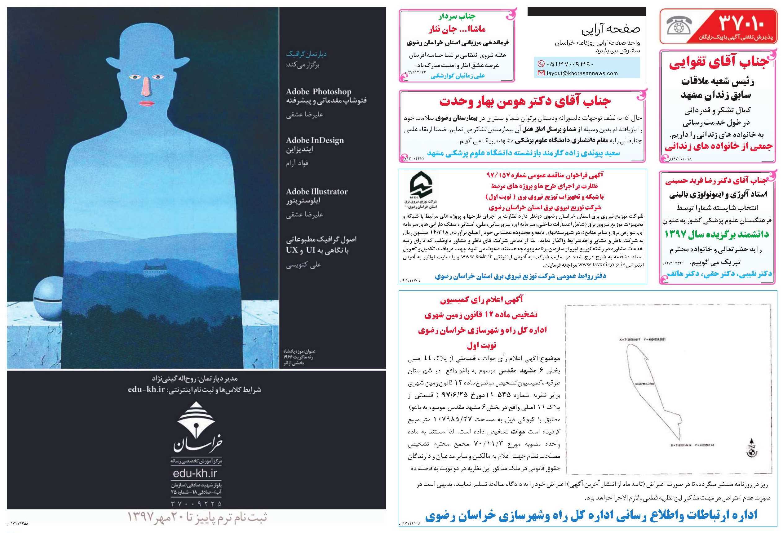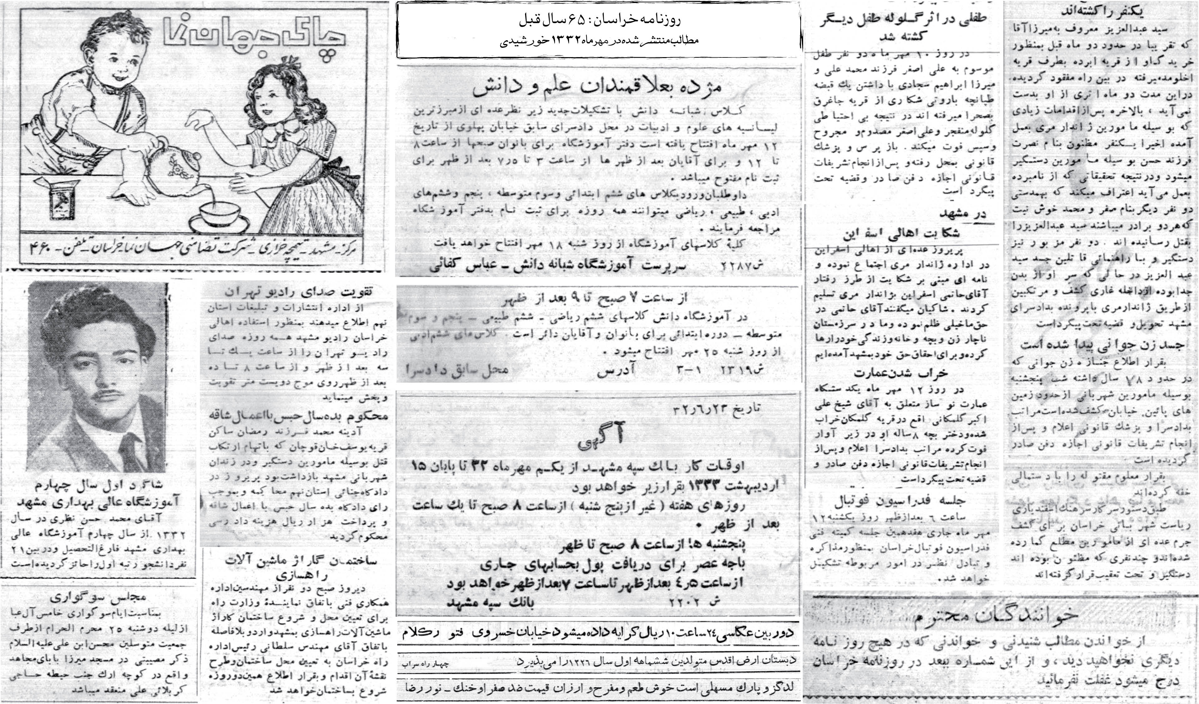 خوانندگان محترم!نظر خودتان درباره صفحه «خراسان قدیم» را که زین پس روزهای چهارشنبه منتشر میشود، از طریق شماره پیامک 2000999 برای ما بفرستید. لطفاً در ابتدای متن پیامک حتما کلمه «قدیم» را قید فرمایید.