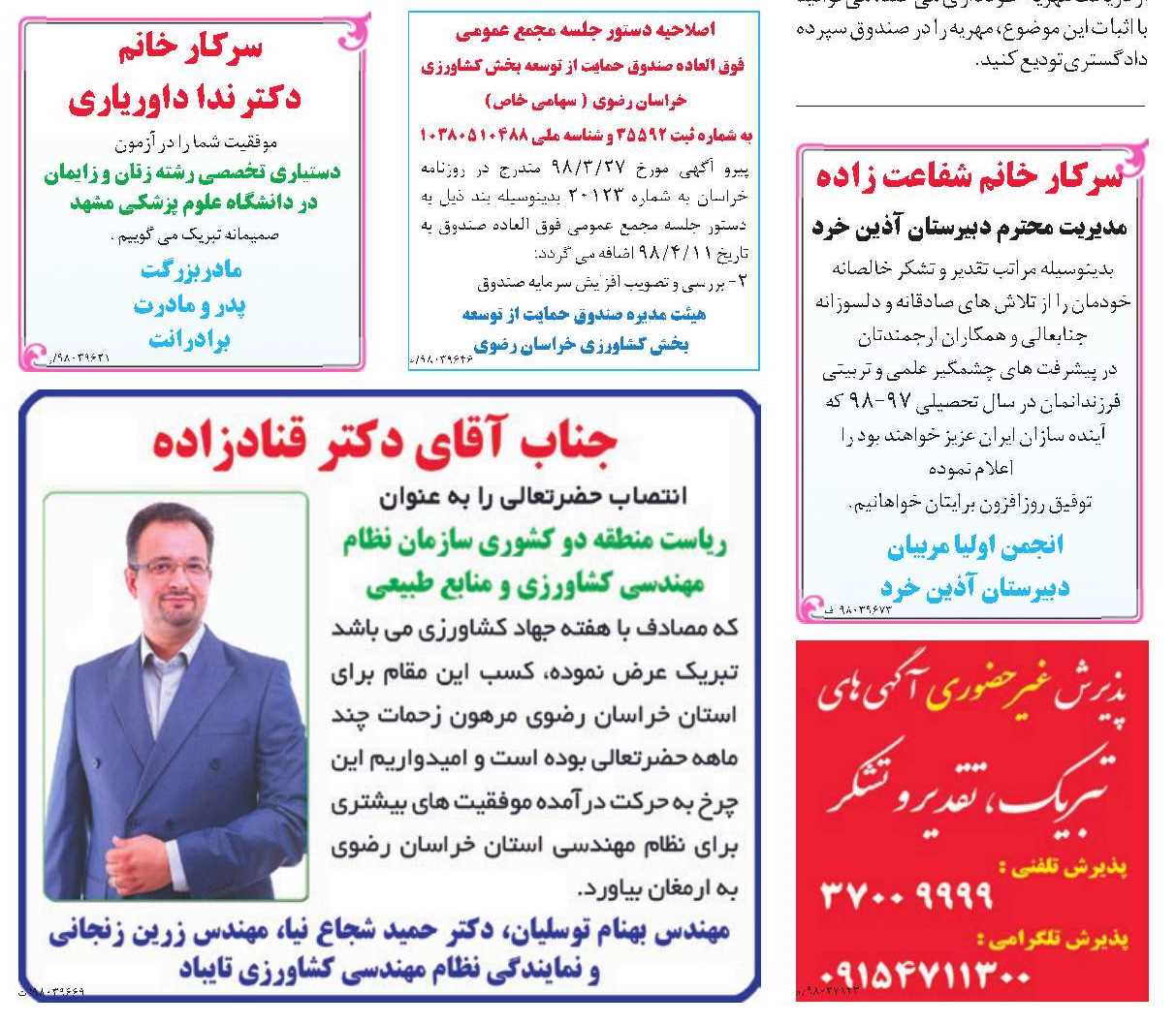 خوانندگان محترم! در صفحه 12 روزنامه خراسان، پاسخگوی پرسش های حقوقی شما هستیم. شما می توانید پرسش های خود را در تمام زمینه های حقوقی، از طریق پیامک به شماره 2000999 ارسال کنید. لطفاً در ابتدای متن پیامک حتما کلمه «حقوقی» را قید فرمایید.