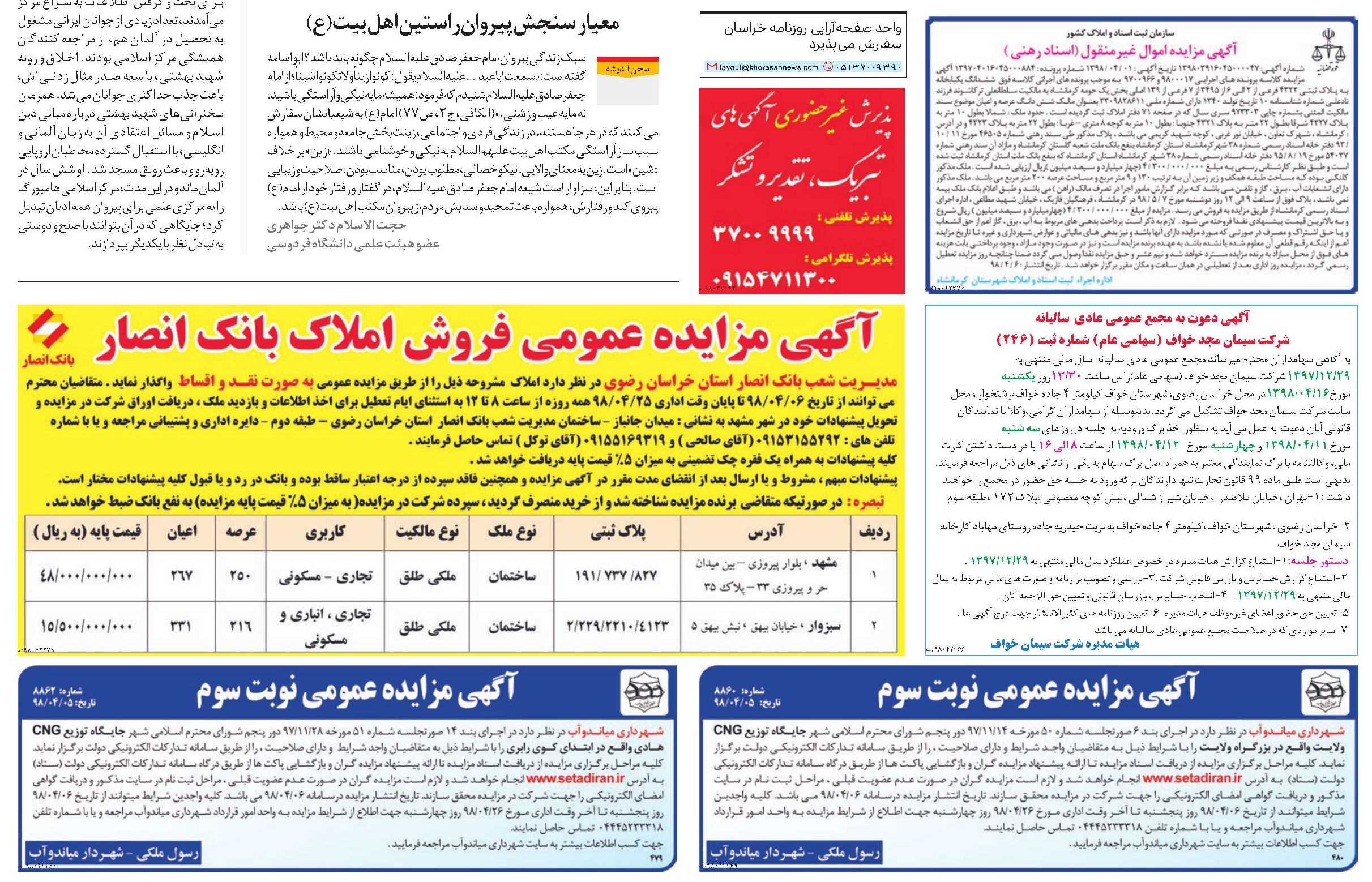 خوانندگان محترم! در صفحه 12 روزنامه خراسان، پاسخگوی پرسش های حقوقی شما هستیم. شما می توانید پرسش های خود را در تمام زمینه های حقوقی، از طریق پیامک به شماره 2000999 ارسال کنید. لطفاً در ابتدای متن پیامک حتما کلمه «حقوقی» را قید فرمایید.
