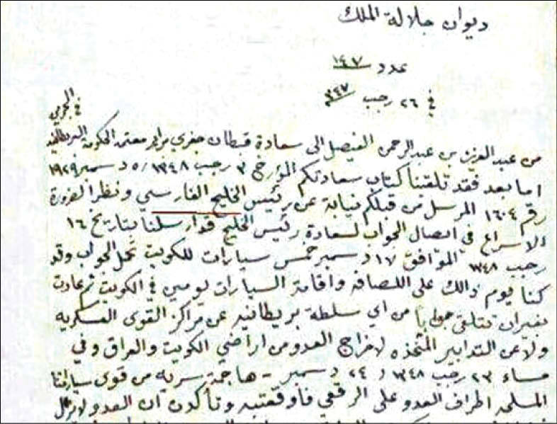 همانطور که اشاره شد، رژیم سعودی در سال 1311 خورشیدی، اعلام موجودیت کرد. با این حال، عبدالعزیز بن عبدالرحمن که در سال 1902 (1281 خورشیدی)، توانستهبود با کودتایی خونین و تحت حمایت انگلیسیها حکومت ریاض را به دست آورد، با همین حمایت و تا سال 1925 (1304 خورشیدی)، بر حجاز و نجد نیز مسلط شد. در همین زمان بود که وی، طی مکاتباتی با نمایندگان دولت انگلیس در منطقه خلیجفارس، از آنها برای فعالیتها و موضعگیریهایش کسب تکلیف میکرد و در خلال همین نامهنگاریها بود که از عنوان خلیجفارس، به کرات و بدون کوچکترین تردیدی استفاده میکرد. در یکی از این اسناد که به تاریخ 26 رجب 1348 هـ.ق (7 دی 1308)، یعنی حدود 91 سال قبل، در قالب نامهای برای نماینده بریتانیا در بحرین نوشته شدهاست، عبدالعزیز، پدر همه پادشاهان سعودی تا امروز، یعنی سعود، فیصل، خالد، فهد، عبدا... و سلمان، رسماً از نام خلیجفارس استفاده میکند و مینویسد: «از عبدالعزیز بن عبدالرحمن الفیصل، به کاپیتان جفری پرایم نماینده حکومت بریتانیا در بحرین؛ اما بعد، نامه فرخنده شما را که در تاریخ دوم رجب 1348 / پنجم دسامبر 1929 و به شماره 1604 [به رشته تحریر درآورده بودید]، دریافت کردیم؛ همان پیامی که از سوی شما به نیابت از فرمانده خلیجفارس ارسال شدهبود.» صرفنظر از محتوای نامه که در واقع نوعی دادخواهی و درخواست میانجیگری از استعمار انگلیس، برای حل و فصل اختلافات دریایی بنیانگذار رژیم سعودی با شیخنشین کویت، بر سر کشتیرانی در خلیجفارس است و نشان از عمق و سابقه اختلافات بین شیوخ کویت و سران رژیم سعودی دارد، دو نکته مهم را میتوان از متن نامه دریافت: