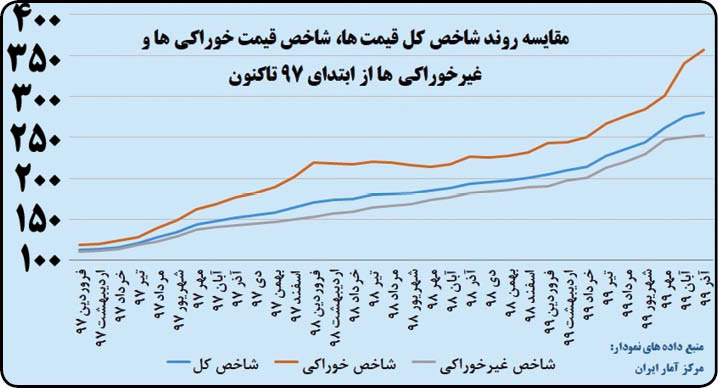 هر چند اعمال سیاست های مقطعی برای کنترل نرخ ارز قابل پذیرش است، اما پافشاری بر سیاست سرکوب ارزی آن هم به قیمت پرداخت بخش قابل توجهی از آن از منابع بانک مرکزی نتیجه ای جز تورم به بار نخواهد آورد. به نظر می رسد همین مسئله هم موجب شده تا رئیس جمهور از بی تفاوتی مردم به بود و نبود ارز 4200 برای حبوبات، برنج و ... سخن بگوید. در واقع تاثیر این سیاست آن قدر کم و کمتر شد تا این که عملاً مردم متوجه حذف این ارز نشدند.به عنوان مثال، گزارش اخیر دیوان محاسبات از نتایج سیاست ارز 4200 که 9 دی ماه در مجلس قرائت شد نشان می دهد که «با وجود اعمال سیاست های حمایتی، قیمت کالاهای اساسی همه گروه های کالایی نسبت به اسفند سال 1396 افزایش قابل ملاحظه ای داشته اند. به طور مشخص 10 قلم کالای اساسی که ارز دولتی دریافت کرده اند، بین 14 تا 169 درصد و با میانگین 70 درصد، رشد قیمت را از اسفند 1396 تا آذر 1398 به خود دیده اند. در حالی که نرخ ارز وارداتی این کالاها در بازه زمانی مذکور ثابت بوده است.» نمودار نشان می دهد که از ابتدای سال 97 و با افزایش نرخ ارز و اختصاص ارز 4200 در عمل شاخص قیمت خوراکی ها که بیشترین ارز 4200 را دریافت کرده اند تاکنون بیش از شاخص کل و شاخص کالاهای غیر خوراکی افزایش یافته است. اما این تمام ماجرا نیست. با گران شدن ارز، دلالان از هر منفذی استفاده کرده اند تا یا ارز یا کالاهای وارداتی با ارز 4200 را در بازار آزاد بفروشند. راه یابی تنها 55 درصد نهاده های دامی به سامانه بازارگاه وزارت جهاد کشاورزی و فقدان واردات با وجود تامین بیش از سه میلیارد دلار ارز 4200 (به گواه دیوان محاسبات) و ترفندهای دیگری نظیر به راه افتادن قاچاق معکوس کالاهای اساسی نظیر کره (به گواه مدیر کل مبارزه با جرایم سازمان یافته گمرک) و نیز سیل واردات از این جمله است که تبعات ملموسی نظیر گران شدن تولید و محصول مرغداری ها را در پی داشته است. این یعنی عملاً حمایت از دلالان به جای حمایت از قشرهای ضعیف!