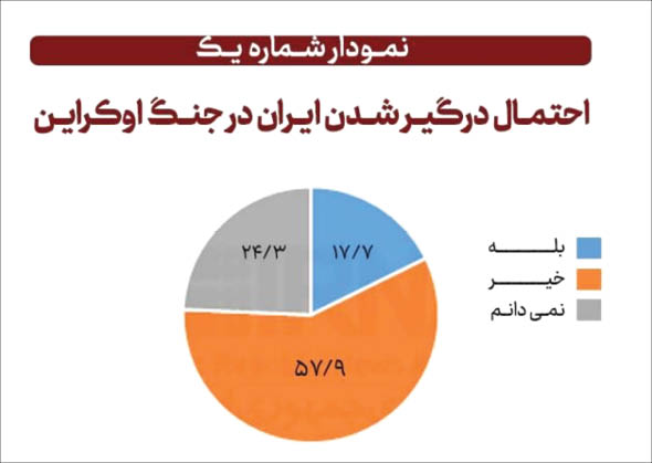 همچنین در این نظر سنجی۱۷.۷ درصد یافتهها نشان میدهد درصدی از پاسخ دهندگان احتمال میدهند که ایران نیز وارد درگیری روسیه و اوکراین خواهد شد و ۵۷.۹ درصد افراد این فرضیه را منتفی میدانند. البته ۲۴.۳ درصد افراد درباره این پرسش، نظری نداشتند و به این سوال پاسخ ندادند که در نمودار نتیجه آن را می بینید.