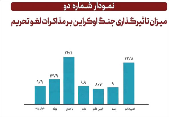 از شهروندان تهرانی پرسیده شد که «این جنگ تا چه حد میتواند بر مذاکرات لغو تحریمها تاثیرگذار باشد؟» ۴۹.۹ درصد پاسخ گویان جنگ اوکراین و روسیه را بر مذاکرات مؤثر دانسته (جمع گزینههای تا حدی، زیاد و خیلی زیاد) و ۲۷.۲ درصد افراد این بحران را بر توافق ایران و ۴+ ۱ بیتاثیر خواندهاند (جمع گزینههای اصلا، خیلی کم و کم).
