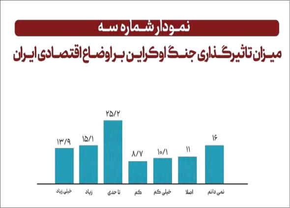 همچنین نظر شهروندان تهرانی درباره میزان تاثیرگذاری جنگ اوکراین و روسیه بر اوضاع اقتصادی ایران پرسیده شد که ۵۴.۲ درصد پاسخ گویان نگران تأثیرپذیری اقتصاد داخلی ایران در سایه این جنگ هستند (جمع گزینههای تاحدی، زیاد و خیلی زیاد) و ۲۹.۸ درصد پاسخ گویان این بحران را بر اقتصاد ایران بیتاثیر دانستهاند (جمع گزینههای اصلا، خیلی کم و کم).