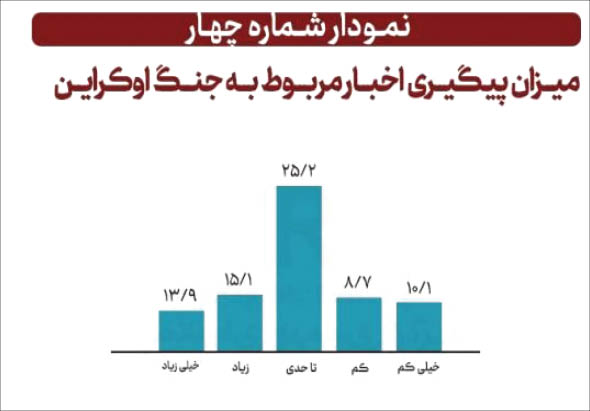 از دیگر یافتههای این پژوهش میتوان به این موضوع اشاره کرد که ۷۱.۶ درصد از پرسششوندگان تهرانی پیگیر اخبار مربوط به جنگ اوکراین و روسیه هستند (جمع گزینههای تاحدی، زیاد و خیلی زیاد) و ۲۸ درصد نیز به میزان کم یا خیلی کم آن را دنبال میکنند. همچنین ۳۹.۸ درصد از پاسخ گویان این نظرسنجی اظهار کرده اند که اولویت آنها در پیگیری اخبار مربوط به جنگ اوکراین و روسیه، رسانه ملی بوده است. فضای مجازی با ۳۴.۴ درصد، رسانههای خارجی با ۱۵.۱ درصد، خبرگزاری های داخلی با ۶.۹ درصد و روزنامهها با ۳.۸ درصد در رده های بعدی پاسخ گویان قرار داشته است.