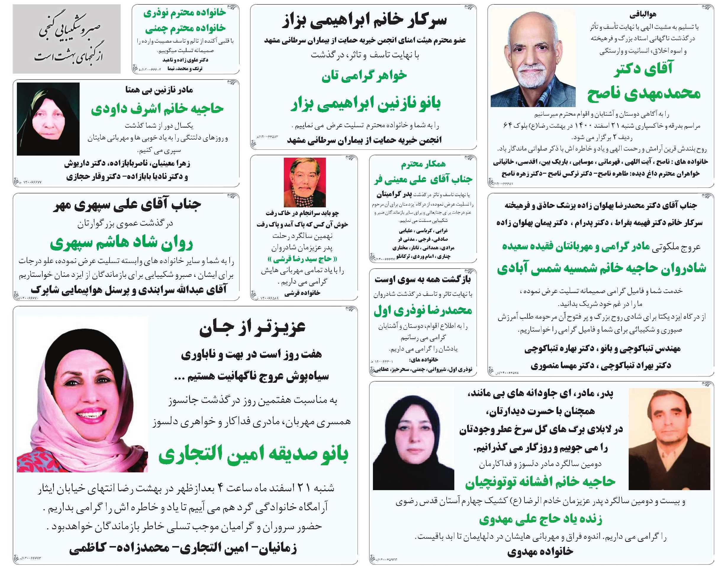 محمدمهدی ناصح در ۸۲سالگی از دنیا رفت. به گزارش ایسنا، این پژوهشگر و استاد پیشکسوت زبان و ادبیات فارسی روز پنجشنبه ۱۹ اسفندماه درگذشت. محمدمهدی ناصح در سال ۱۳۱۸ متولد شد. او پژوهشگر ادبیات فارسی، مصحح و استاد بازنشسته دانشگاه فردوسی مشهد بود. ناصح برای تصحیح کتاب «روضالجنان و روحالجنان فی تفسیرالقرآن» (بههمراه محمدجعفر یاحقی) برگزیده کتاب سال ایران شد. از آثار او میتوان به «راهنمای نگارش و ویرایش»، «شعر دلبر: دوبیتیهای عامیانه بیرجندی»، «شعر نگار: دوبیتیهای عامیانه بیرجندی»، «شعر غم»، «گزیده مرصادالعباد»، «گنج شایگان: معرفی پاسداران زبان فارسی در شبه قاره هند و پاکستان» و... اشاره کرد. موسسه فرهنگی شهرکتاب در متنی دراینباره نوشته است: «بازگشت همه به سوی اوست. با کمال اندوه و تاسف بسیار، دکتر محمدمهدی ناصح ،استاد بازنشسته دانشگاه فردوسی مشهد روز پنجشنبه نوزدهم اسفند روی در نقاب خاک کشید و به ملکوت اعلی پیوست. روح پاک این استاد وارسته، نیکنهاد و مهربان در سرای باقی، مینوی و شادمان باد. مرکز فرهنگی شهرکتاب درگذشت دکتر ناصح را به خانواده محترم ایشان و اصحاب فرهنگ و اندیشه تسلیت میگوید. نامش همیشه زنده و یادش گرامی باد.»روزنامه خراسان نیز درگذشت این استاد پیشکسوت را به خانواده گرامیاش و شاگردان و استادان گرانمایه دانشگاه فردوسی تسلیت میگوید و برای ایشان علو درجات از درگاه خداوند متعال مسئلت میکند.