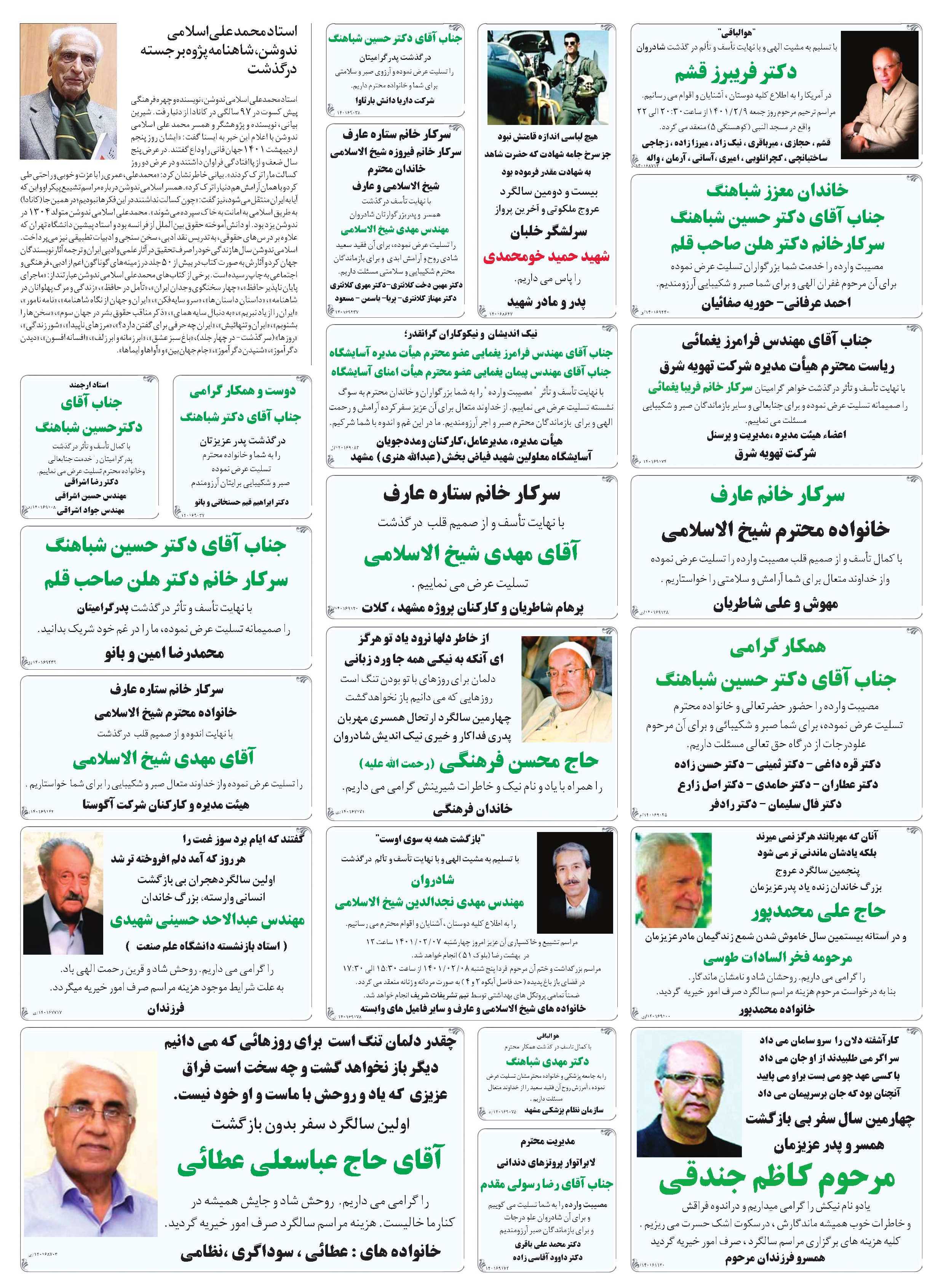 استاد محمدعلی اسلامی ندوشن، نویسنده و چهره فرهنگی پیش کسوت در ۹۷ سالگی در کانادا از دنیا رفت. شیرین بیانی، نویسنده و پژوهشگر و همسر محمد علی اسلامی ندوشن با اعلام این خبر به ایسنا گفت: «ایشان روز پنجم اردیبهشت 1401جهان فانی را وداع گفتند. در عرض پنج سال ضعف و از پاافتادگی فراوان داشتند و در عرض دو روز کسالت ما را ترک کردند». بیانی خاطرنشان کرد: «محمدعلی، عمری را با عزت و خوبی و راحتی طی کرد و با همان آرامش هم دنیا را ترک کرد». همسر اسلامی ندوشن درباره مراسم تشییع پیکر او و این که آیا به ایران منتقل میشود، نیز گفت: «چون کسالت نداشتند در این فکرها نبودیم؛ در همین جا (کانادا) به طریق اسلامی به امانت به خاک سپرده میشوند». محمدعلی اسلامی ندوشن متولد ۱۳۰۴ در ندوشن یزد بود. او دانشآموخته حقوق بینالملل از فرانسه بود و استاد پیشین دانشگاه تهران که علاوه بر درسهای حقوقی، به تدریس نقد ادبی، سخن سنجی و ادبیات تطبیقی نیز میپرداخت. اسلامی ندوشن سالها زندگی خود را صرف تحقیق در آثار علمی و ادبی ایران و ترجمه آثار نویسندگان جهان کرد و آثارش به صورت کتاب در بیش از ۵۰ جلد در زمینههای گوناگون اعم از ادبی، فرهنگی و اجتماعی به چاپ رسیده است. برخی از کتابهای محمدعلی اسلامی ندوشن عبارتند از: «ماجرای پایان ناپذیر حافظ»، «چهار سخنگوی وجدان ایران»، «تأمل در حافظ»، «زندگی و مرگ پهلوانان در شاهنامه»، «داستان داستانها»، «سرو سایهفکن»، «ایران و جهان از نگاه شاهنامه»، «نامه نامور»، «ایران را از یاد نبریم»، «به دنبال سایه همای»، «ذکر مناقب حقوق بشر در جهان سوم»، «سخنها را بشنویم»، «ایران و تنهائیش»، «ایران چه حرفی برای گفتن دارد؟»، «مرزهای ناپیدا»، «شور زندگی»، «روزها» (سرگذشت - در چهار جلد)، «باغ سبز عشق»، «ابر زمانه و ابر زلف»، «افسانه افسون»، «دیدن دگر آموز»، «شنیدن دگر آموز»، «جام جهانبین» و «آواها و ایماها».