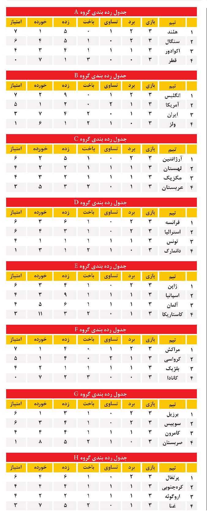 گروه ورزش/ لقب جام شگفتیها بدون شک و تردید برازنده بیستودومین دوره مسابقات جامجهانی است. با این حال اگر نتوانستهاید رقابتهای این دوره را بهصورت مرتب دنبال کنید برای پی بردن به گزاره نخست کافی است اتفاقات شب دوازدهم مسابقات را از دریچه هر یک از هشت تیم گروههای پنج و شش مرور کنید.