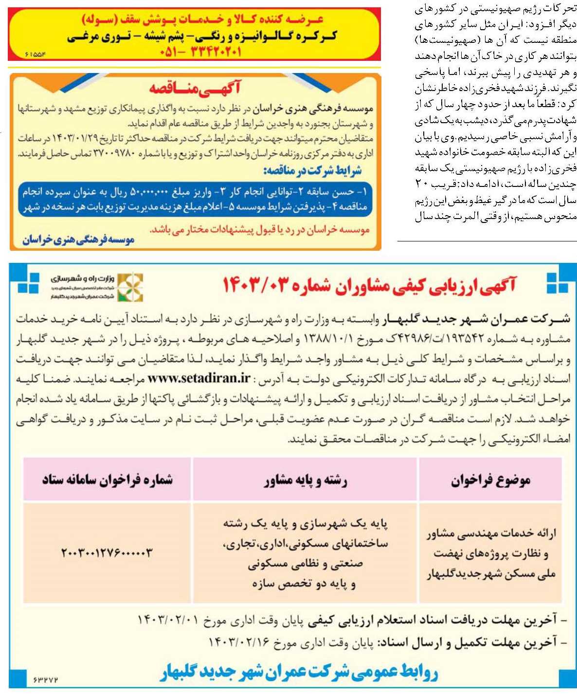 تلفن: 37009111 051 پیامک: 2000999 تلگرام: 09033337010