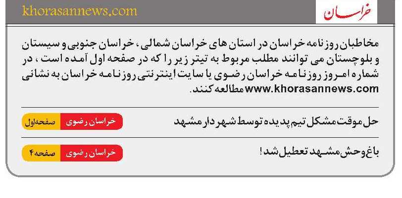 خراسان عزیز! می خواهم بدانی تو تنها رسانه ای هستی که من و امثال من به آن دسترسی داریم. می دانم همه حرف ها قابل چاپ نیست. ما هم نمی خواهیم در این شرایط بد اقتصادی نان کسی آجر شود. گاهی پیامی که می دهم آن قدر تند است که مطمئنم چاپ نمی شود ولی بیشتر از آن مطمئنم که خوانده می شود و می دانم خودت آن را به گوش مسئولان می رسانی. پاینده باشی.