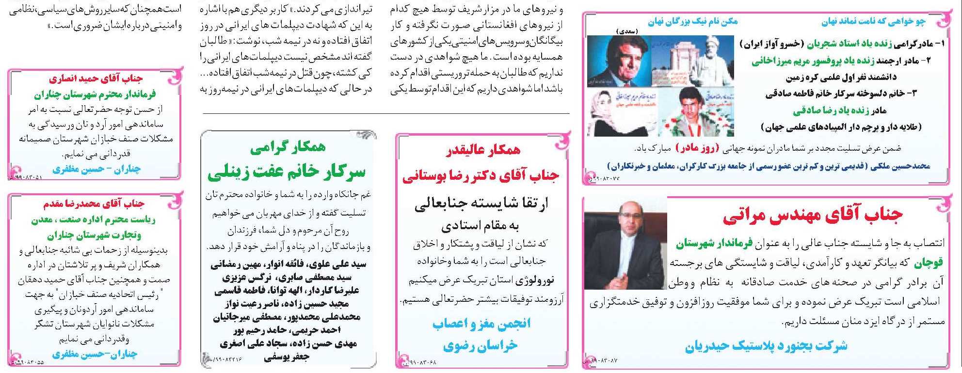 وطن امروز – این روزنامه با تیتر «شهرداران بازداشت، حناچیخاموش!» نوشت:۳ هفته از بازداشت شهرداران مناطق ۲ و ۸ تهران به اتهام مسائل مالی، گذشته، اخبار تأیید نشده نیز از احضار یکی از اعضای شورای شهر به دادگاه حکایت دارد، اما شهرداردرباره این موضوع سکوت کرده است!