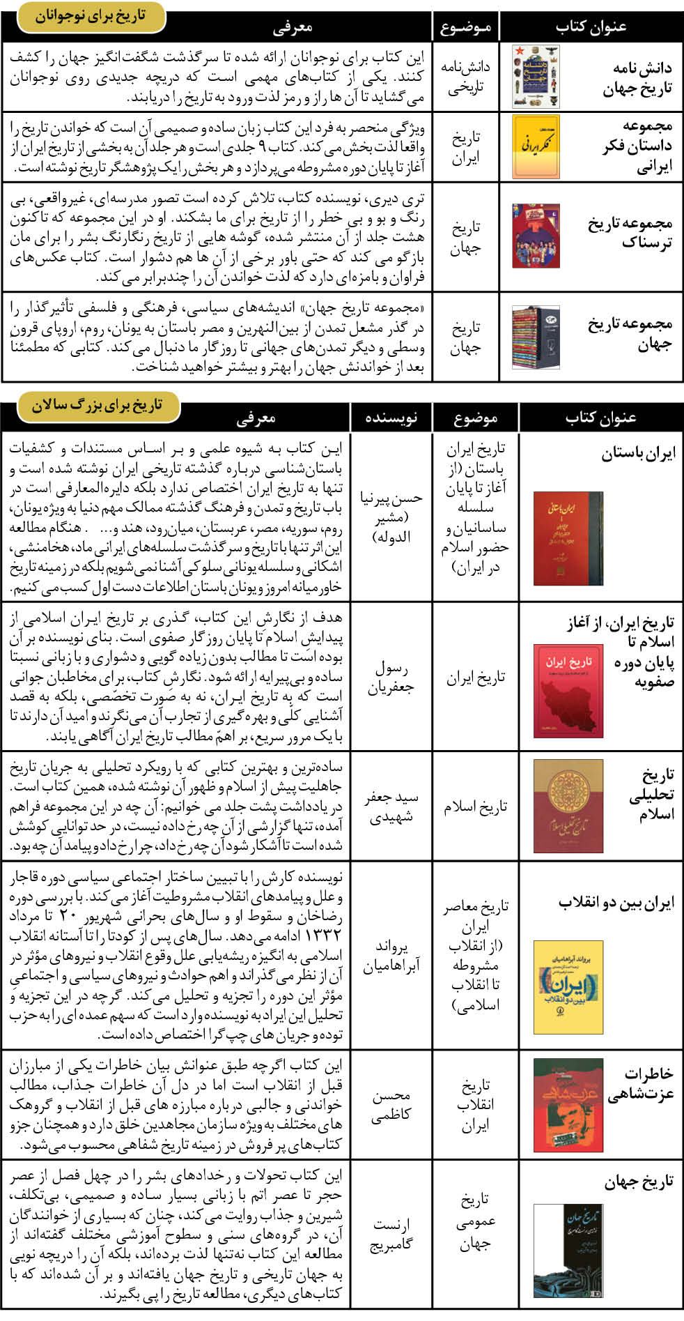 الهام یوسفی- آدمها معمولاً در برابر بسیاری از موضوع هایی که در مکالمات روزمره میشنوند، سه واکنش از خود نشان میدهند؛ یا از آن موضوع و محتوای بیان شده بیزارند و بعد از شنیدنش قیافهشان سرشار از نفرت میشود یا به شدت عاشق آن موضوع هستند و با شنیدن آن، خوشی از سر و روی شان میریزد و نگاهشان رنگ عاشقانه میگیرد یا در برابر آن موضوع خنثی هستند و هیچ حس و واکنش قابل بیانی ندارند. اما موضوعی هست به نام «تاریخ» که آدمها در برابر شنیدن آن تنها دو احساس دارند: «عشق و نفرت!» آدمها یا عاشق خواندن تاریخ هستند یا به واسطه درسهای خشک و کسلکننده تاریخ دوره راهنمایی و دبیرستان از آن نفرت دارند اما به هر حال هر دو گروه به دانستن تاریخ نیاز دارند. چرا که به قول معروف: «ملتی که تاریخ خود را نداند محکوم به تکرار آن است.» ممکن است در ظاهر فایدهای در خواندن تاریخ نبینید. ممکن است به نظرتان برسد که دانستن تاریخِ تولد و مرگ یک عده آدم در گذشتههای دور و آمدن و رفتن یک سلسله اهمیت خاصی ندارد. به شما خواهیم گفت که اگر فکر میکنید تاریخ به معنای دانستن این چیزهاست، سخت در اشتباه هستید. اگر با پرونده امروز همراه شوید درباره واقعیت تاریخ و فایدههای آن بهتر خواهید فهمید. یاد میگیرید برای خواندن تاریخ سراغ چه کتابهایی بروید و چگونه تاریخ بخوانید؟ بخشی از کتابهای سنین و سلایق مختلف را به شما معرفی خواهیم کرد و در مجموع به شما خواهیم گفت که چه چیزی تاریخ است و چه چیزی نیست.